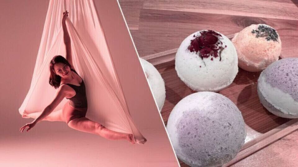 (45 mins) Moms learn aerial yoga while kids learn to make aromatherapy crafts.